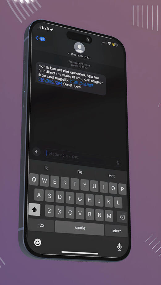 Je klant wordt niet weggedrukt, maar hoort een professionele boodschap. Direct daarna sturen wij automatisch een SMS met een link naar jouw WhatsApp. Zo start de klant meteen een chatgesprek en mis jij nooit meer een lead.